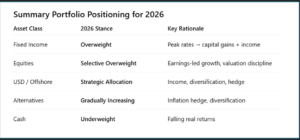 The investment environment in 2026 calls for selectivity, forward-looking positioning, and active diversification. As markets transition from peak tightening to normalization, opportunities will increasingly favour investors who anticipate, rather than react to, policy and market inflection points. Our views are as follows: